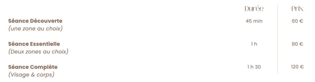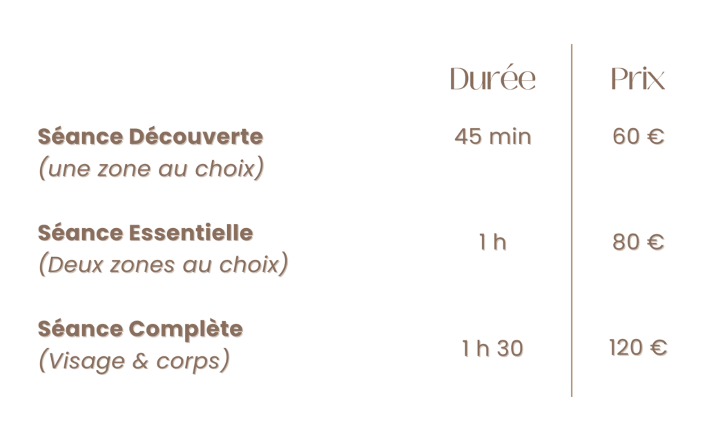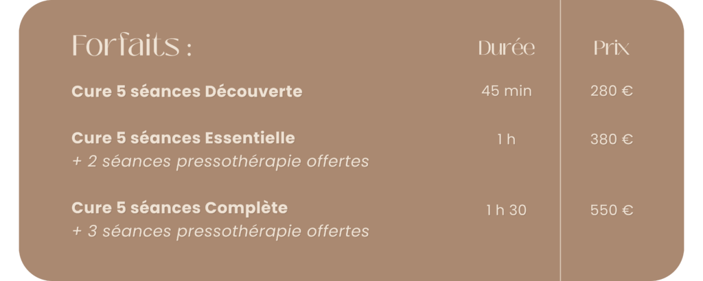 MES PRESTATIONS Madérothérapie & drainage lymphatique Madérothérapie : qu’est-ce que c’est ? C’est une technique de massage d’origine colombienne qui utilise des outils en bois spécialement conçus pour remodeler le corps. Bienfaits :Activation de la circulation sanguine & drainageRéduction de la celluliteRemodelage de la silhouetteRelaxation Madérothérapie : qu’est-ce que c’est ? C’est une technique de massage d’origine colombienne qui utilise des outils en bois spécialement conçus pour remodeler le corps. Bienfaits :Activation de la circulation sanguine & drainageRéduction de la celluliteRemodelage de la silhouetteRelaxation RESERVEZ Pressothérapie : qu’est-ce que c’est ? Un soin qui fait circuler, qui libère, qui allège. Grâce à des pressions d’air rythmées et enveloppantes. Une séance de 30 minutes pour 30 € Bienfaits :Stimule la circulation lymphatique et veineuseRéduit la rétention d’eau et soulage la sensation de jambe lourdeAméliore la récupération après une séance de sportElimine les toxines RESERVEZ Pressothérapie : qu’est-ce que c’est ? Un soin qui fait circuler, qui libère, qui allège. Grâce à des pressions d’air rythmées et enveloppantes. Une séance de 30 minutes pour 30 € Bienfaits :Stimule la circulation lymphatique et veineuseRéduit la rétention d’eau et soulage la sensation de jambe lourdeAméliore la récupération après une séance de sportElimine les toxines RESERVEZ Envie d’offrir ? Carte cadeau disponible pour tous les soins Pensez à la demander en institut ! 35 impasse Nicolas Appert 26780 Malataverne Mon espace bien-être ce trouve au cœur du Salon 202, dans une cabine privative dédié à la détente et au bien-être.Uniquement sur rendez-vous ! Contactez - moi