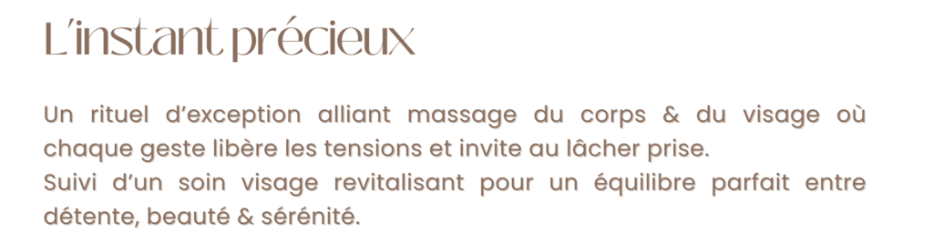 MES PRESTATIONS Rituels Bien-être RESERVEZ RESERVEZ RESERVEZ RESERVEZ Envie d’offrir ? Carte cadeau disponible pour tous les soins Pensez à la demander en insitut ! 35 impasse Nicolas Appert 26780 Malataverne Mon espace bien-être ce trouve au cœur du Salon 202, dans une cabine privative dédié à la détente et au bien-être.Uniquement sur rendez-vous ! Contactez - moi